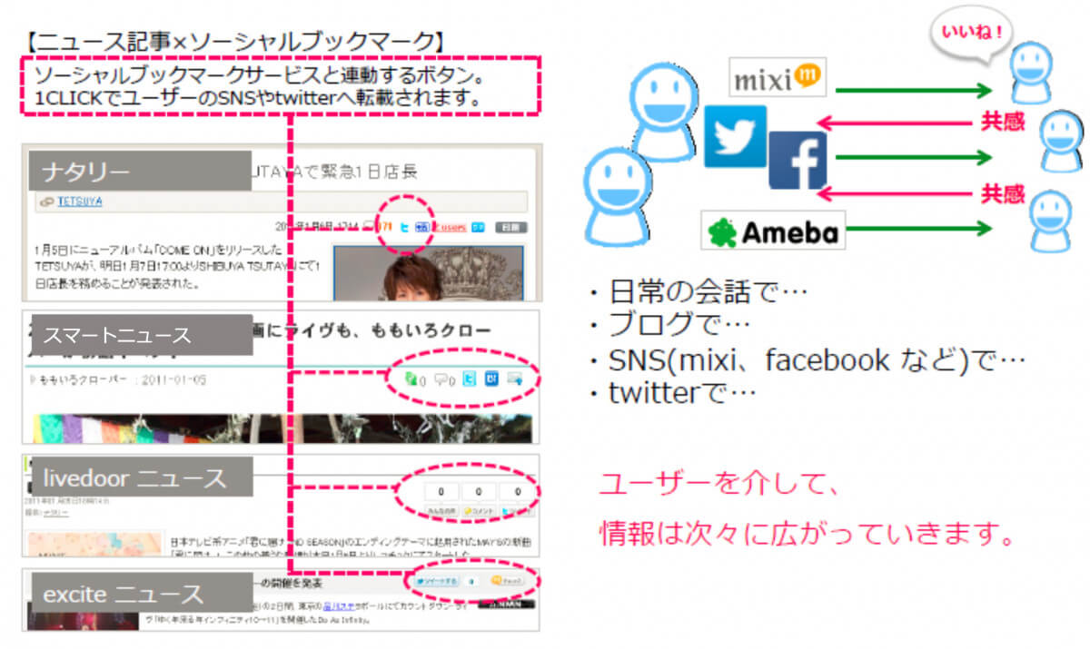 ニュース記事によって、会話の口コミはもちろん、ソーシャルメディアを通した情報の波及を期待できます。