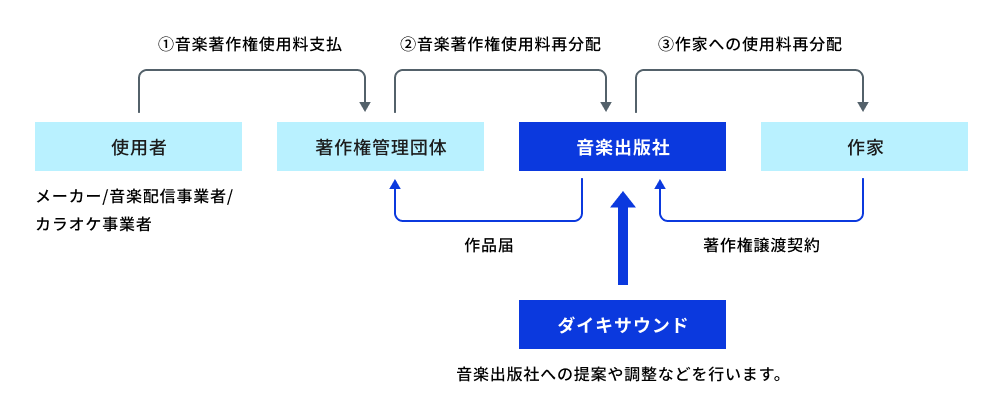 音楽出版社へ作家が著作権譲渡することで、細かな著作権料分配業務を請け負って頂けます。